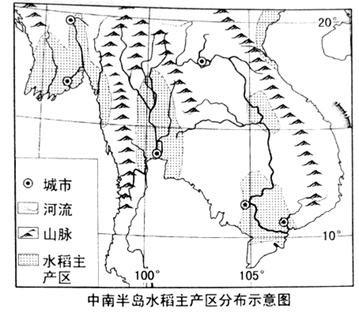 阐述中南半岛自然地理环境特征,分析这些特征对该区域水稻主产区、人口和城市分布的有利影响。(14分)