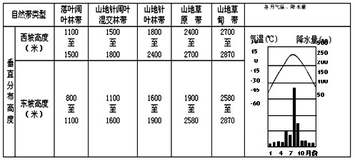 4、单选题 下面图表表示我国某主要地形区中,某山自然带的垂直分布和该地形区中某城市年内各月气温和降水量图。根据所学知识回答1~2题。