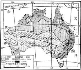【小题2】该图为澳大利亚,西临印度洋,故排除③⑤两点。①地降水主要受东北信风越过赤道,偏转成西北风,从印度洋带来丰富的水汽;②④受西风带控制的时候降水多,受西风带时候,水汽主要来自印度洋,