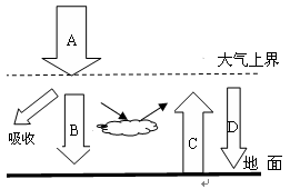 【小题1】读图,分析图中字母表示的含义。A是到达大气上界的太阳辐射,B是被大气削弱后,到达地面的太阳辐射,C是地面辐射,大部分被大气吸收,使大气增温,D是大气逆辐射,补偿地面辐射损失的能量。所以正确的是选项D。选项A、B、C错。