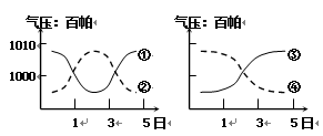 暖锋过境前,气温低,气压高。过境后,气温升高,气压降低。③错,④对。所以C错,D对。①中心气压低,是气旋过境,②中心气压高,是反气旋过境,A、B错。
