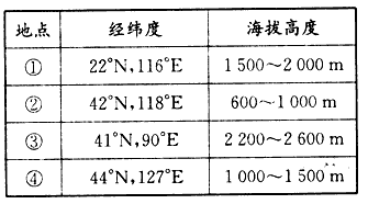 3、单选题 读四个地点的山地上某植被类型海拔高度分布表,回答1~2题。