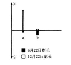 5、单选题 读图,a、b两城夏至日和冬至日正午旗杆(等高)的影长及朝向,据此回答下题。