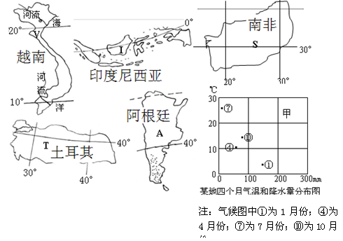 (2)读“某地四个月气温和降水量分布图”,该地代表的气候类型是???????????????,(1分) V、I、S、T、A五国中的??????(1分)(填字母)国家分布有该气候类型。