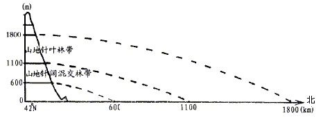 北纬某山地部分垂直自然带与水平自然带对应关系示意图