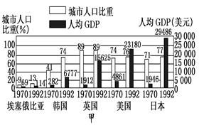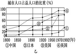 材料2:部分国家城市化及其经济发展情况统计图(图甲)和部分国家城镇人口在总人口中所占百分比统计图(图乙)。