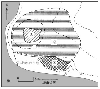 2、单选题 读“欧洲西部某沿海城镇功能分区图”,图中的虚线为等高线(单位:米),海防堤是为应对海平面上升1米而设计的。据此回答下面1—3题。