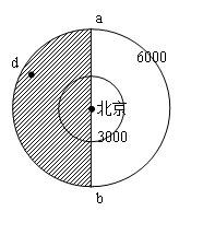 3、单选题 “从北京(40?N,116?E)看世界”,下图为以北京为中心,3000Km、6000Km为半径的图,图中ab为部分的经线圈,阴影部分为黑夜;地球半径取6370千米。完成下题: