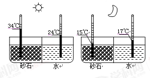 【小题1】从图中数据可以看出,砂石的昼夜温差为19℃,水的昼夜温差为7℃.与砂石相比,水体白天温度低,晚上温度高,昼夜温差小。