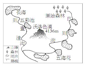 1、单选题 九寨沟景区有着千姿百态的岩溶地貌景观,以水景最为奇丽,湖、泉、瀑、滩连缀一体,呈Y形分布。下图为“九寨沟导游图”,读图回答下列问题。