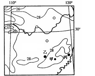 读图可知,甲地位于武夷山区,地势高,气温低。图中等高距为2℃,根据等值线“高于高的,低于低的”原则,可知甲的范围是小于28℃大于26℃。