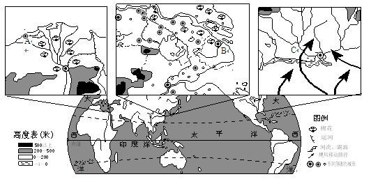 据图分析:A为埃及尼罗河三角洲地中海沿岸,B为长江三角洲,C密西西比河下游。