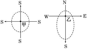 5、单选题  下图中,虚线代表甲、乙两地同一天物影的影长及朝向的时间变化。据此回答小题。