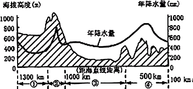 1、单选题 下图为“我国中温带某地的地形剖面图及年降水量曲线图”,读图回答题。