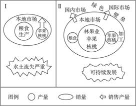 1、综合题 下图是“山西、陕西农业产业结构调整示意图”。Ⅰ表示以粮食为主的阶段,Ⅱ表示以发展林果业为主的阶段。读图,完成下列问题。