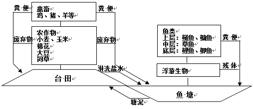 本题解析:试题分析:小题1:图中显示的低洼地养鱼,台田种植农作物,牲畜的粪便可以作为肥料,因地制宜发展农业,并将废物回收利用,发展了生态农业;低洼积水地方如蒸发量大,会出现盐碱化,发展鱼塘可以减轻盐碱化,所以选A项。