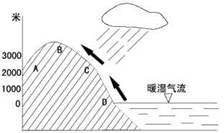 1、单选题  图中,A、B、C、D四处中降水量最多的是:   (  )