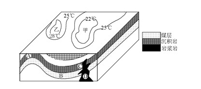 5、综合题 读“某地地质构造剖面及其地面等温线分布示意图”,回答问题。