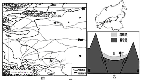 喀什是中国的西大门,是中西亚文化交融的城市、新疆最著名的古城。2010年,中央正式批准喀什设立经济特区。 下图中甲、乙两图为喀什所在区域图和地质剖面图。