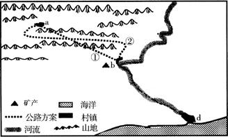 (1)计划修建从a村到b镇的公路,在图中①②两个线路方案中,你认为较为合理的是???,理由是?????????????????????????????????????????????????????????????。(4分)