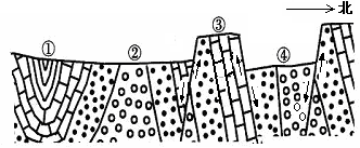 (1)图中①②③④四处,在地质构造上属于背斜的是???????,属于向斜的是????????,属于地垒的是???????,属于地堑的是???????。在野外考察中,有时会见到一些在向斜构造上发育的山地,其原因是?????????????????????????????????????????????。