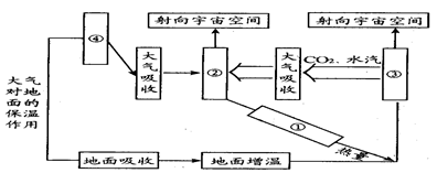 【小题1】图示地面增温的直接热源是太阳辐射,故④表示太阳辐射,地面增温,则发出地面辐射③,绝大部分被大气吸收,大气发出大气辐射②;大气辐射中射向地面的部分为大气逆辐射①,把能量还给了地面,对地面起了保温作用。
