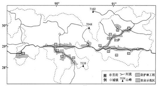 1、单选题 下图为我国西藏局部区域防护林工程分布示意图。几十年前,图示区域被认为是西藏风沙最大的地方,如今,经过多年的植树造林工程,沿江沿河的防护林体系基本建成。数据显示,和30年前相比,图示区域大风天气年均减少32天。读下图回答下列各题。