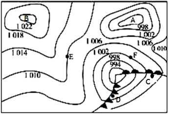 (2)根据天气系统的常见符号可知,此时D处位于冷锋的锋面之前,处于暖气团的控制下,结合冷锋的特点及其不同时期的天气特点可以推断:过境前气温高,气压低,天气晴朗;冷锋过境时:气温降低,气压降低 阴雨天气;过境后:处于冷气团控制下气温低,气压高,天气晴朗。