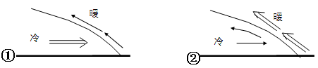本题解析:试题分析:小题1:由图可知:①图冷暖气团移动方向相反,为冷锋。②图冷暖气团移动方向一致,为暖锋。