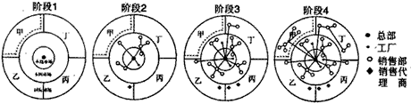 3、单选题  ??? 下图反映的是某公司逐步扩展的四个阶段。图中内圆表示公司早期市场区,中圆表示国内市场区,外圆四个部分表示不同的国外市场。回答(1)——(3)题。