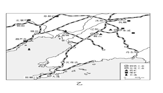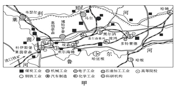 5、综合题 昔日的德国鲁尔工业区由于百年来的工业生产,留下污染严重的环境。今日的鲁尔区有的工厂变成了攀岩场;钢铁厂被改造成公园;巨大的厂房成了绝妙的PARTY场所(如图甲)。