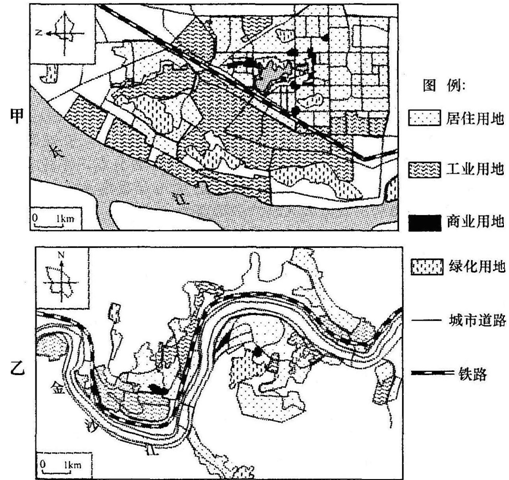 5、单选题  读下面我国两个重要钢铁工业城市土地利用图,回答下列各题。