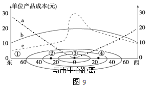 1、单选题  读图9“某工业部门在某城市及其附近地区土地、运输和劳动力等成本曲线图”,其中土地成本和运费都只与距城市中心的远近有关。读图完成问题。
