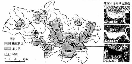 本题解析:小题1:以汶川地震为背景考查地质灾害类型及其分布特点,通过题干提供的堰塞湖的概念可以推出汶川地震引发的地质灾害有崩塌、滑坡或泥石流,根据图中信息可以得到极重灾区主要是沿河谷呈条带状分布。