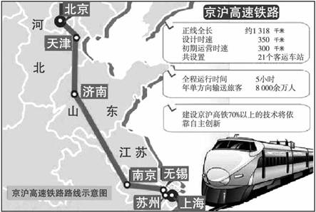 2、综合题 背景材料:投资估算1 300多亿元、设计时速350千米、初期运营时速300千米,运营后北京至上海只需5小时……2006年4月3日,铁道部宣布京沪高速铁路预计年内正式开工、2010年投入运营的消息,引起人们高度关注。