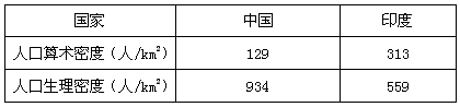 (2)根据材料二分析,中国和印度两国人口压力较大的是 ,并说明判断理由。?