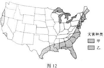 第(1)题,根据图例可知,甲自然灾害主要分布太平洋沿岸地区,位于环太平洋地震带上,应为地震,乙自然灾害主要分布大西洋和墨西哥湾沿岸地区,应为飓风。