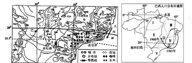 (4)根据图表信息,简述巴西人口分布特点。近年来该国对甲河流域的农业人口进行了适当外迁,试分析其主要原因。(8分)