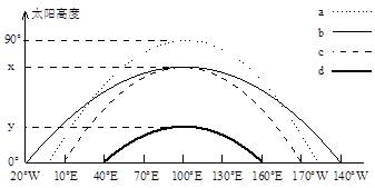 1、单选题  下图为某日a、b、c、d四条纬线上太阳高度随经度的变化图。读图,完成下列各题。