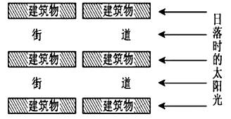 4、单选题 每年的5月30日前后,日落时的金色阳光洒满美国纽约曼哈顿(40°N,74°W)的所有某走向的街道,呈现一幅壮观的景象,即“曼哈顿悬日”现象。下图表示此时阳光与街道的位置关系。据此回答下列各题。