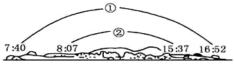 3、单选题 读我国①②两地某日日出日落示意图(图示为北京时间),回答下列各题