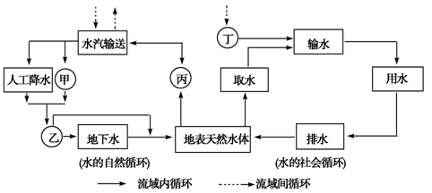 【小题1】甲与人工降水是并列的,则甲为降水;乙是靠降水补充而又可以补给地下水,还与地表天然水体有关系,故乙为表径流;丙与地表天然水体和水汽输送有关系,则丙为蒸发;丁通过流域间循环进行输水,则丁为跨区域调水。故B对。
