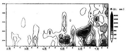 2011年2月至7月,110—120°E平均降水量纬度-时间分布图