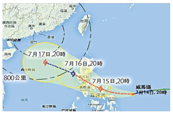 3、单选题 2014年7月18日,据中央气象台消息,今年第9号台风“威马逊”(超强台风级)18日15时30分从海南省文昌市翁田镇沿海登陆,右边为台风“威马逊”的移动路径示意图,据此回答下列小题。