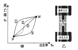 该国人口的数量变化是从M到N,初期出生率大于死亡率,人口快速增长;末期死亡率逐渐上升至两者接近(出生率略高)。图中③线上任意一点,出生率与死亡率相等。③线以下,均为出生率高于死亡率,③线以上则相反。故而,图甲中代表该国人口自然增长从M到N转变的轨迹一般是曲线应该是④。图乙中,青年所占比重较少,一般是人口迁出造成。人口大量迁移,国内交通运输可能面临较大压力。图甲中N阶段出生率与死亡率相等,劳动力一般比较少。