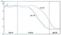 人口的增长模式是由出生率、死亡率和自然增长率三项指标共同构成的,依据不同历史阶段人口的出生率、死亡率和自然增长率,世界人口增长模式可以划分为原始型、传统型和现代型三种类型(下图)。
