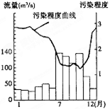 人类生产生活中的废水,不加处理,任意排放。常造成严重的水质污染,从而破坏水体环境。上图是黄河中游某支流一水文站流量和污染程度的实测结果。