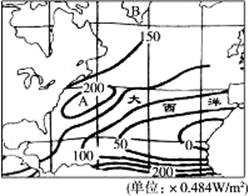 2、单选题 图为“某大洋部分海区年平均逐日从海洋输入大气的总热量分布图”,完成问题。