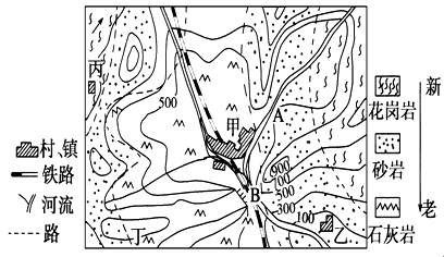 (1)图中的地质构造是___________,判断依据是_____________________________。甲地地貌形成的主要地质作用是__________________。 (3分)