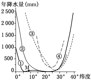 【小题1】结合图中四条曲线分布纬度范围和降水量大小,再结合所学知识世界各大洲西海岸的气候类型分布相关知识。北美和澳大利亚没有赤道经过,北美西部的温带海洋性气候因为位于山地的迎风坡,年降水超过1500mm,所以③曲线是北美大陆;④曲线是澳大利亚;①曲线赤道附近降水在1000mm,可以判断出①为南美大陆,则②为非洲大陆。